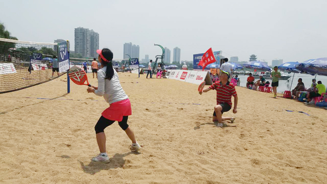 本网讯(通讯员梁赞斌)沙滩网球诞生于2000年,是集网球和沙滩排球于一体的一项全新运动。越来越多的网球爱好者奔向沙滩,在阳光下享受网球运动所带来的快乐。