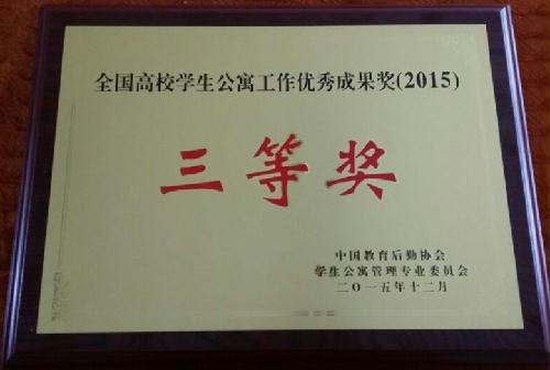 本网讯 2015年全国高校学生公寓工作优秀成果颁奖仪式12月21日在厦门举行,校后勤处宿管中心盛金锋老师申报的论文《试论社会背景下高校宿管服务改进路径:基于实证》获得全国课题研究成果三等奖。为调动各高校进一步做好学生公寓工作的积极性,改革创新、攻坚克难、破解共性难题,同时提高工作成果的实用性和参考价值,鼓励先进、以点带面,中国教育后勤协会学生公寓管理专业委员会在全国范围开展了“全国高校学生公寓工作优秀成果奖(2015)”评选活动,各高校共申报参评作品275份,经过各省区初评、专家组最终评审、中国教育后勤协会核准,全国共评选18个一等奖、37个二等奖、50个三等奖。除学校外,华科大、华师大分获二等奖;武汉大学、中南民大、湖北工程学院分获三等奖。(后勤处)
