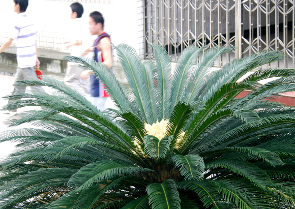 最近,我校温泉校区出现了难得一见的景观:多年铁树开了花。据悉,在A、B栋教学楼之间共有5株铁树,是在2001年种植的。开花的有3株(2雄1雌)。师生们兴奋地相互转告,有的还用手机拍照留下纪念。